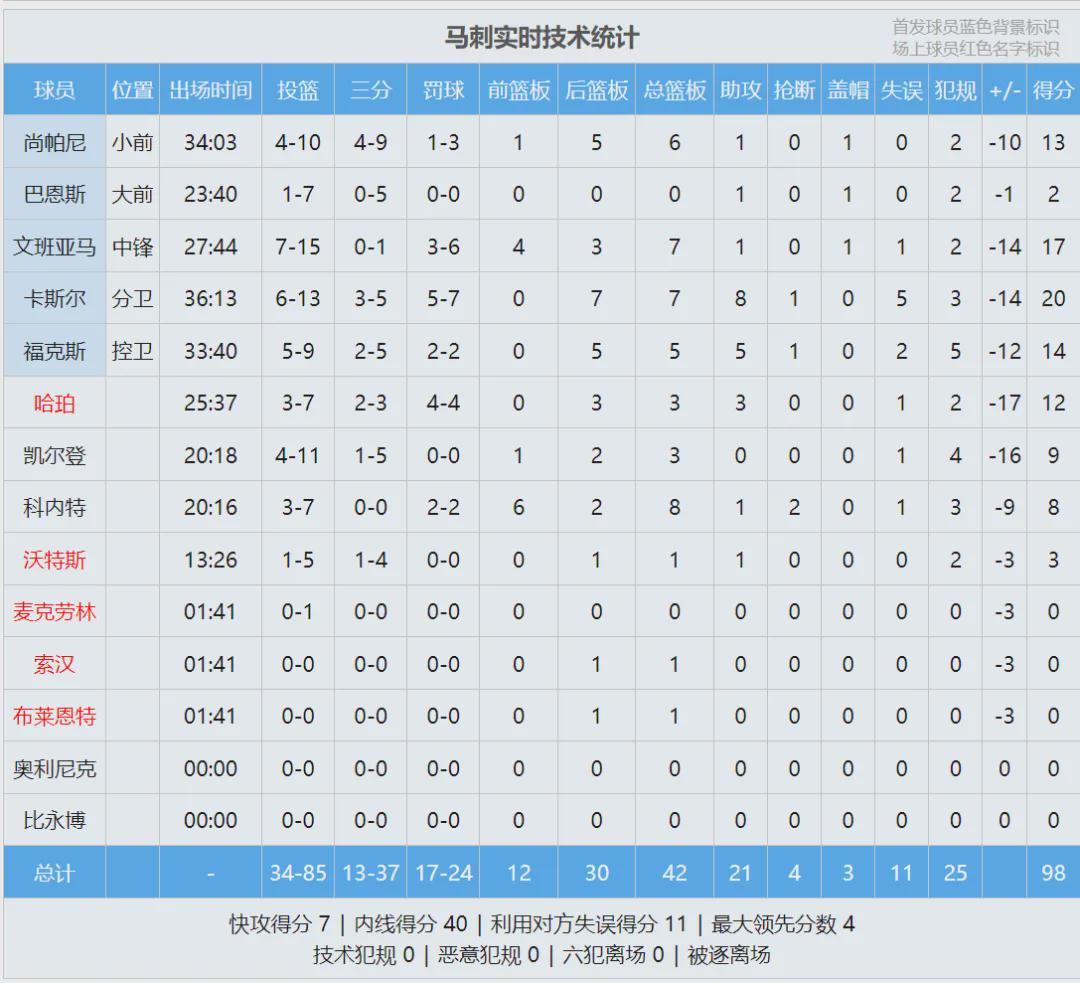 马刺这边,卡斯尔20分7板8助5失误、文班亚马17分7板1助、福克斯14分5板5助1帽。哈珀高开低走,首节3中2,之后三节4中1。此役过后,马刺27胜13负仍排西部第二,但胜场数已被掘金追平,仅领先第四的森林狼0.5个胜场。