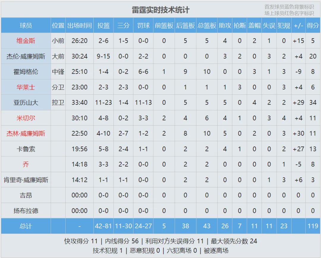 第四节中段,凯尔登连得5分,马刺一度追到12分。卡鲁索连得5分回应,雷霆再次拉开。文班第三节得到4分,第四节仅得3分。全场结束,雷霆119-98大胜马刺21分。亚历山大34分5板5助4帽、杰威20分3助2断!雷霆盖帽数11-3!