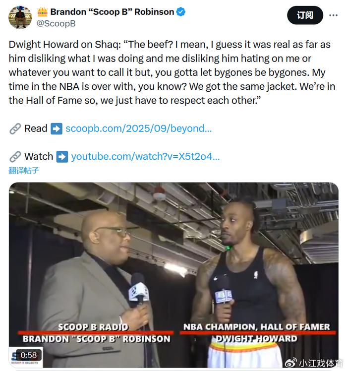 霍华德随后继续说道:“不过,过去的事情就让它过去吧,我在NBA的日子已经结束了。你要知道,我们都穿上名人堂那件标志性夹克了。既然都入选了名人堂了,那我们肯定得互相尊重。”